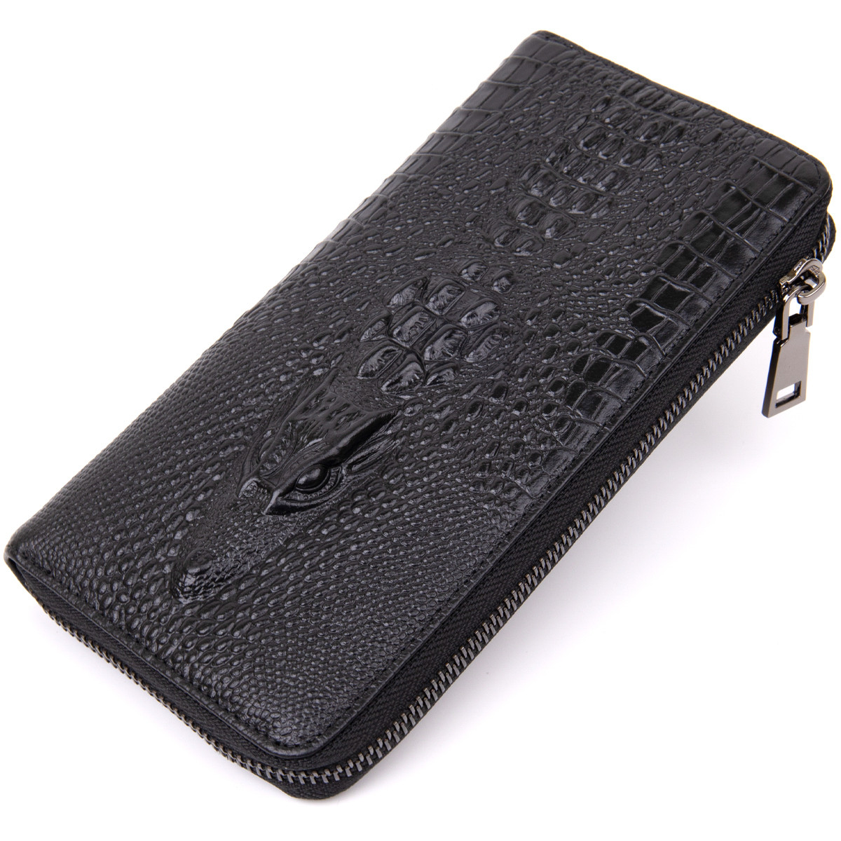 Місткий клатч з силуетом крокодила на лицьовій стороні під шкіру рептилії. Виріб виконаний в чорному кольорі. Клатч зручно лежить в руці. Має відділення для купюр і відділення для монет. Аксесуар помістить в себе купюри в розгорнутому вигляді, монети і картки. Виріб в масивному дизайні. Клатч вертикального типу. Закривається клатч на блискавку. У комплекті йде пилозахисний чохол.